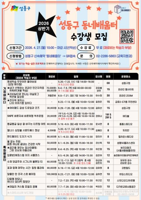 ‘성동구 동네배움터’ 상반기 프로그램은 오는 4월 27일 오전 10시부터 성동구청 누리집(홈페이지)의 신속예약시스템을 통해 신청할 수 있으며, 교재 및 재료비를 제외한 모든 프로그램의 수강료는 무료다.