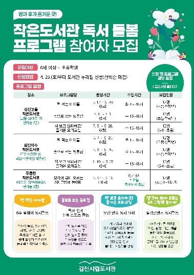주요 프로그램으로는 다양한 주제의 책을 읽고 공예 활동을 하며 창의력을 키우는 '책 먹는 아이들', 북 컬링·솔로 탁구 등 신체 놀이를 통해 독후감을 몸으로 표현하는 '몸으로 쓰는 독후감상문', 도서 내용과 연계된 요리를 직접 만들며 올바른 식습관을 형성하는 '즐거운 요리교실' 등이 준비되어 있다.