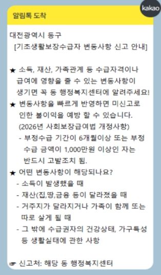 뉴한국방송뉴스통신사 신태공 기자 | 대전 동구는 국민기초생활보장 생계급여 수급자를 대상으로 ‘변동사항 신고 알림톡’ 서비스를 본격 운영한다고 24일 밝혔다.