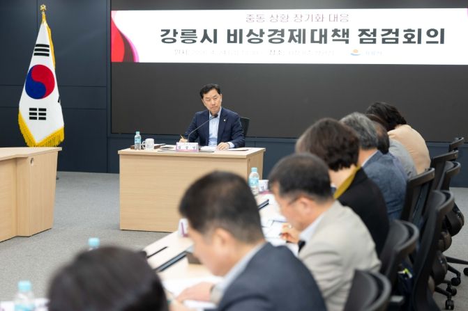뉴한국방송뉴스통신사 양호선기자 기자 | 강릉시는 24일 시청 8층 상황실에서 중동상황 장기화에 따른 유가 상승 및 원자재 수급 차질 등 지역경제 전반에 미치는 영향을 점검하고 선제적 대응 방안을 마련하기 위해 비상경제대책 점검회의를 개최했다.