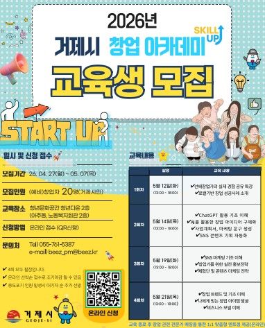 뉴한국방송뉴스통신사 신유철기자 기자 | 거제시는 지역 내 예비 창업자와 일반 시민이 일상 속 아이디어를 창업 으로 구현해볼 수 있도록 돕는'2026년 거제시 창업 아카데미' 교육생을 오는 4월 27일부터 모집한다.
