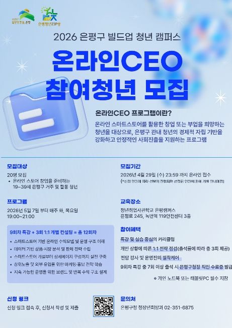 프로그램은 다음 달 7일부터 주 2회 운영된다. 모집 대상은 온라인 스토어 창업·부업을 준비하는 19세부터 39세까지 청년으로, 은평구 거주자를 우선 선발해 총 20명을 모집한다. 신청은 홍보물 내 큐알(QR)코드를 통해 온라인으로 접수하면 된다.
