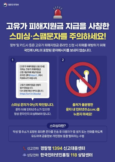 한편, 시는 ‘고유가 피해지원금 지급’을 사칭한 스미싱 문자에 대해 각별한 주의를 당부했다. 고유가 피해지원금은 카드사 또는 지역화폐 공식 앱이나 누리집(홈페이지), 오프라인에서만 신청이 가능하다. 특히 공공기관에서는 고유가 피해지원금과 관련된 인터넷 주소(URL) 링크 연결을 유도하는 문자를 보내거나 전화하지 않는다고 강조했다.