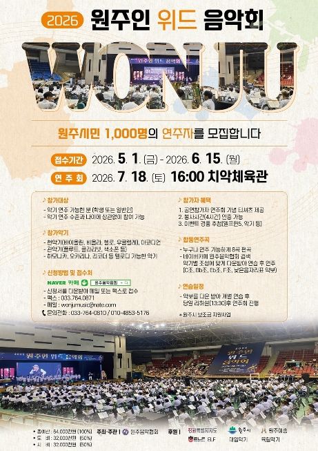 뉴한국방송뉴스통신사 양호선기자 기자 | (사)한국음악협회 원주지부는 오는 7월 18일 열리는 ‘2026 원주인 위드 음악회’에 참여할 시민 연주자 1,000명을 모집한다.