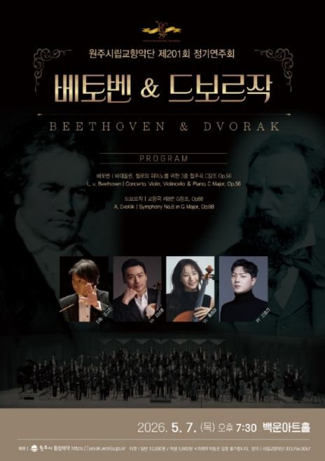 뉴한국방송뉴스통신사 양호선기자 기자 | 원주시립교향악단 제201회 정기연주회가 오는 5월 7일 오후 7시 30분 백운아트홀에서 개최된다. 이번 연주회에는 지휘자 조규진과 바이올리니스트 김남훈, 첼리스트 홍승아, 피아니스트 신효건이 협연자로 나서 베토벤 3중 협주곡 C장조와 드보르작 교향곡 제8번 G장조를 선보일 예정이다.