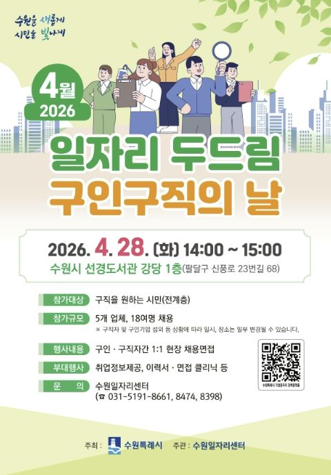 뉴한국방송뉴스통신사 신유철기자 기자 | 수원특례시는 4월 28일 오후 2시부터 3시까지 선경도서관 강당에서 ‘4월 일자리 두드림 구인·구직의 날’을 개최한다.