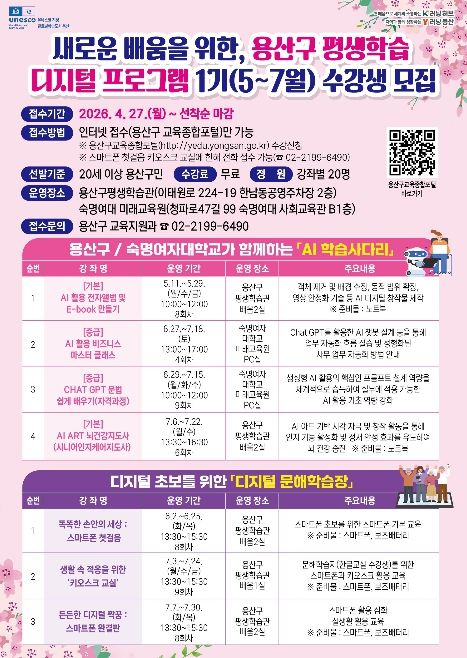 뉴한국방송뉴스통신사 신유철기자 기자 | 서울 용산구가 ‘2026년 평생교육 분야 공모사업’에서 서울시 자치구 중 유일하게 교육부 2개, 서울시 2개 등 총 4개 분야에 동시 선정됐다.