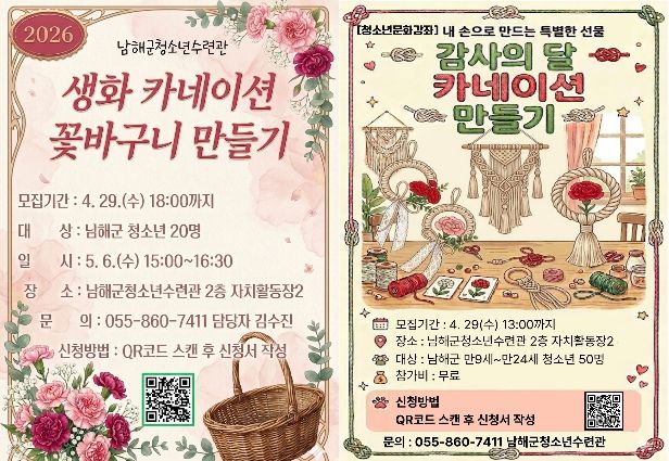 프로그램은 ▽5월 2일부터 3일까지‘마크라메 카네이션 리스 만들기’ ▽5월6일‘생활 카네이션 꽃바구니 만들기’로 나누어 진행된다. 보다 많은 청소년에게 참여 기회를 제공하기 위해 1인 1개 프로그램만 신청 가능하다.
