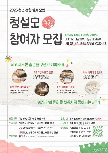 유유기지 부평 관계자는 “청설모는 청년들이 자신의 생활을 주도적으로 설계하고, 기록을 통해 변화를 체감할 수 있도록 돕는 프로그램”이라며 “이번 4기 역시 참여자들이 일상의 작은 실천을 통해 스스로의 변화를 발견하는 계기가 되길 바란다”고 말했다.