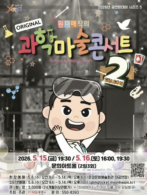 뉴한국방송뉴스통신사 신유철기자 기자 | 문경문화예술회관에서는 5월 어린이 달을 맞아 마술과 과학의 경계를 넘나들며 온가족 모두가 재미있게 관람할 수 있는 과학마술콘서트 시즌2 공연을 5월 15일 19:30, 16 16:00, 19:30 (2일 3회)에 문희아트홀에서 개최한다.