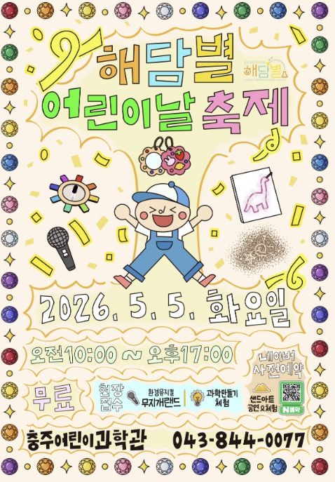 뉴한국방송뉴스통신사 권영분기자 기자 | 충주어린이과학관은 오는 5월 5일 어린이날을 맞아 연나이 8세 이하 어린이와 동반 가족을 대상으로 ‘해담별 어린이날 축제’를 무료로 개최한다고 밝혔다.