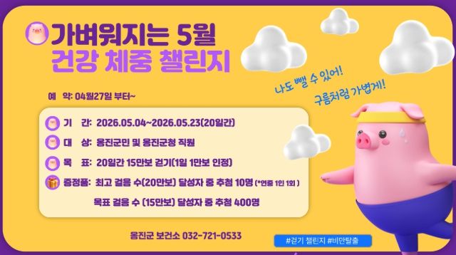 뉴한국방송뉴스통신사 신유철기자 기자 | 옹진군은 군민의 일상 속 걷기 실천을 유도하고 비만 예방 및 건강체중 관리를 지원하기 위해 5월 4일부터 23일까지 20일간 '가벼워지는 5월, 건강체중'챌린지 참가자를 4월 27일부터 모집한다고 밝혔다.