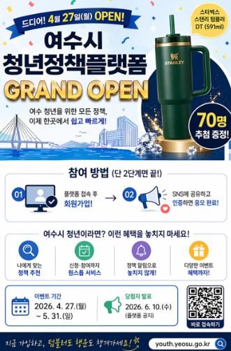 뉴한국방송뉴스통신사 신다은기자 기자 | 여수시는 청년들에게 맞춤형 정책 정보를 제공하고 양방향 소통을 지원하기 위한 ‘여수시 청년정책 플랫폼’을 27일 정식 운영 개시하고, 이를 기념한 특별 이벤트를 진행한다고 밝혔다.