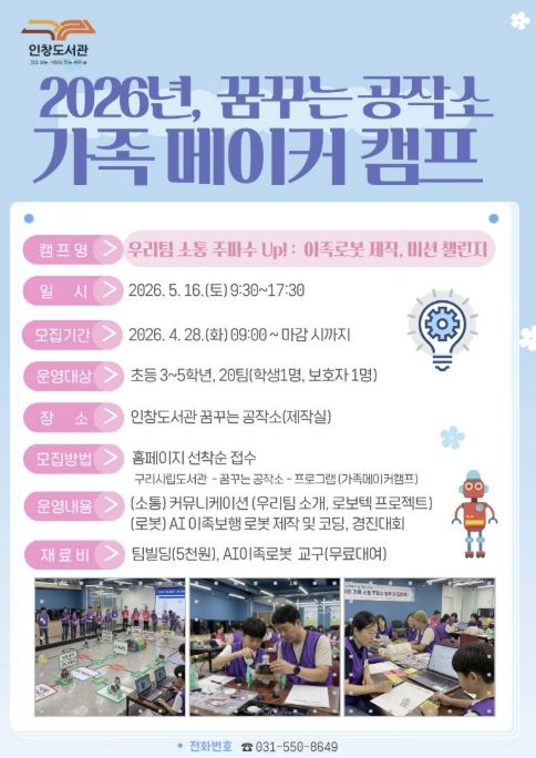 뉴한국방송뉴스통신사 신유철기자 기자 | 구리시 인창도서관‘꿈꾸는 공작소’는 오는 5월 16일 초등학생 자녀와 보호자가 함께 참여해 가족 간 유대감을 높이고 인공지능을 체험하는 '우리 팀 소통 주파수 Up! : 이족로봇 제작, 미션 챌린지' 가족 메이커 캠프를 운영한다고 밝혔다.