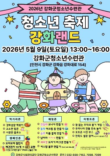 뉴한국방송뉴스통신사 신유철기자 기자 | 강화군청소년수련관이 오는 9일, 5월 ‘청소년의 달’을 맞아 청소년과 지역 주민이 함께 즐길 수 있는 청소년 축제 '강화랜드'를 개최한다.