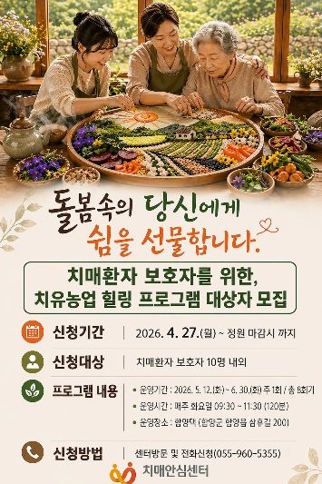 모집 대상은 치매 환자를 돌보고 있는 보호자로, 신청은 4월 27일부터 정원 마감 시까지 선착순으로 접수한다. 참여를 희망하는 경우 함양군 치매안심센터 방문 또는 전화로 신청할 수 있다.