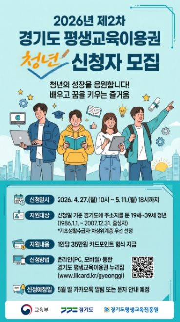 이번 사업은 경제적 여건과 관계없이 학습 참여를 지원하는 평생교육 이용권으로, 신청대상자는 경기도에 주민등록상 주소를 둔 19~39세 청년이며, 선정 시 1인당 35만 원의 교육비(수강료 및 교재비)를 지원받는다.