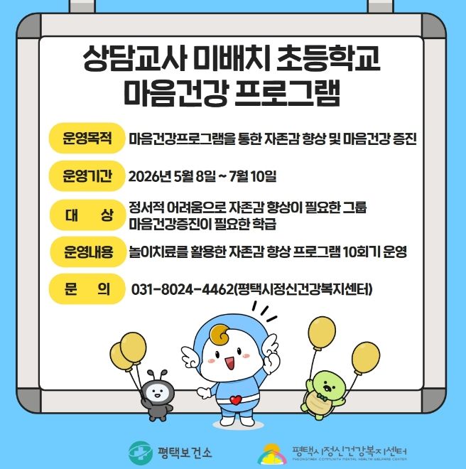 뉴한국방송뉴스통신사 신유철기자 기자 | 평택시는 상담교사가 배치되지 않은 초등학교 학생들의 정신건강 지원을 위해 ‘마음건강 프로그램’을 운영한다고 밝혔다.