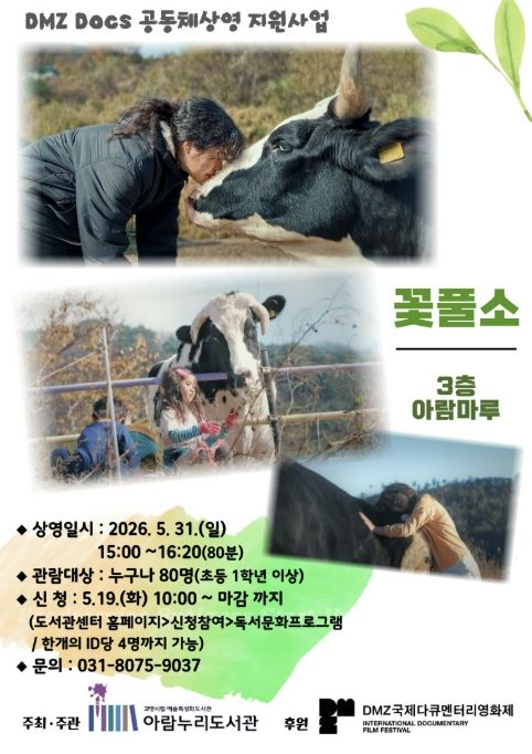 뉴한국방송뉴스통신사 신유철기자 기자 | 고양특례시 아람누리도서관은 DMZ국제다큐멘터리영화제와 협업해 오는 5월 31일 오후 3시, 도서관 3층 아람마루에서 다큐멘터리 영화 ‘꽃풀소’ 상영회를 개최한다.