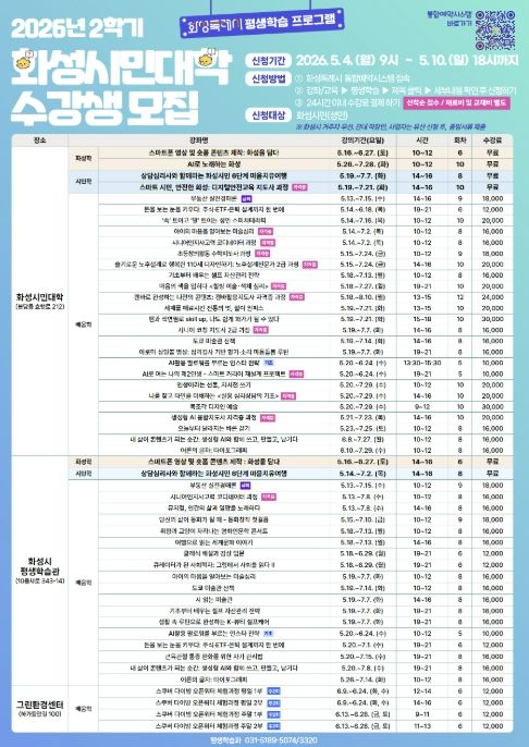 뉴한국방송뉴스통신사 신유철기자 기자 | 화성특례시는 2026년 화성시민대학 2학기 수강생을 오는 5월 4일부터 5월 10일까지 선착순으로 모집한다고 밝혔다.