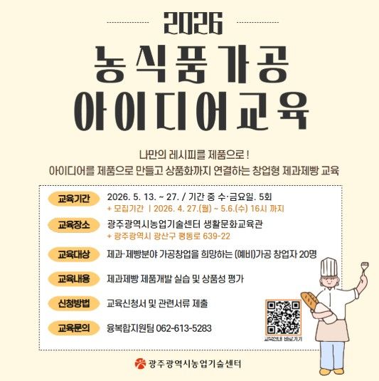 뉴한국방송뉴스통신사 김성의 기자 | 광주광역시 농업기술센터는 제과·제빵 창업을 희망하는 예비창업자를 대상으로 ‘농식품 가공 아이디어 교육’을 5월 13일부터 27일까지 총 5회 과정으로 운영한다.