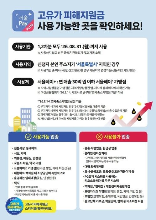 지원금은 행정안전부 지침에 따라 2026년 8월 31일까지 서울 소재 연매출 30억 원 이하 가맹점에서 사용 가능하고, 기한 내 사용하지 못한 잔액은 자동 회수된다. 또한 서울사랑상품권으로 지급된 지원금은 기존 상품권과 달리 ‘선물하기’ 기능은 제한된다.