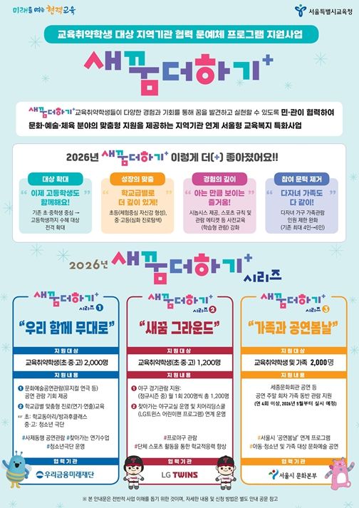 뉴한국방송뉴스통신사 신유철기자 기자 | 서울특별시교육청은 교육취약학생에게 문화·예술·체육 및 진로탐색 기회를 제공하는 민관협력 교육복지 사업 ‘새꿈더하기’를 2026년 더욱 확대 운영한다고 밝혔다.