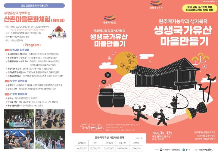 이번 사업은 국가유산청 ‘우리고장 국가유산 활용사업’의 10대 브랜드사업으로 선정됐으며, 강원특별자치도 무형유산인 원주매지농악을 활용한 공연·체험·축제 등 다양한 복합 프로그램을 운영해 시민과 관광객이 원주매지농악을 향유할 수 있는 환경을 마련하고 있다.