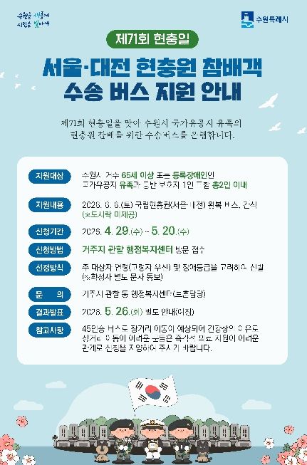 수원시 관계자는 “지금의 대한민국이 있기까지 나라를 위해 희생하고 헌신한 분들을 기억할 것”이라며 “국가유공자 유족들이 안전하고 편안하게 현충원에 다녀오실 수 있도록 최선을 다하겠다”고 말했다.