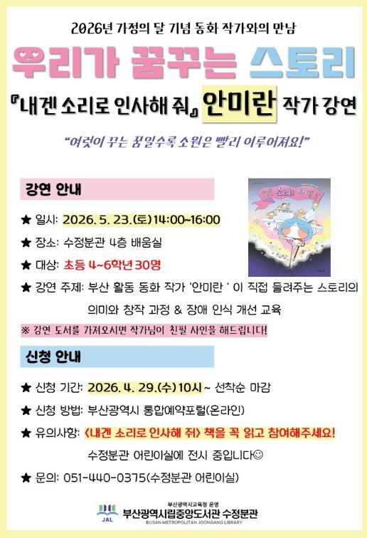 뉴한국방송뉴스통신사 신유철기자 기자 | 부산광역시립중앙도서관은 다음달 23일 중앙도서관 수정분관에서 초등학생 4~6학년 30명을 대상으로 가정의달 기념 안미란 동화 작가와의 만남 ‘우리가 꿈꾸는 스토리’를 운영한다.