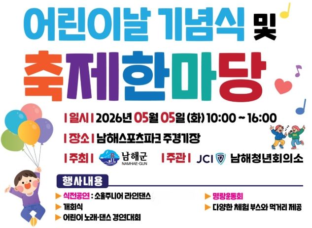 뉴한국방송뉴스통신사 신유철기자 기자 | 남해군은 5월 5일 어린이날을 맞아 ‘제104회 어린이날 기념식 및 축제한마당’을 남해스포츠파크 주경기장에서 개최한다.