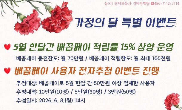 이미숙 경제체육과장은 “가정의 달을 맞아 추진하는 이번 특별이벤트가 지역 내 소비를 촉진하고, 소상공인과 자영업자의 매출 증대는 물론 지역경제 활성화에도 기여할 것으로 기대한다”고 말했다.