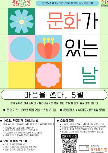뉴한국방송뉴스통신사 신유철기자 기자 | 부평구 부개도서관은 5월 가정의 달 특별 프로그램 ‘마음을 쓰다, 5월’을 운영한다.