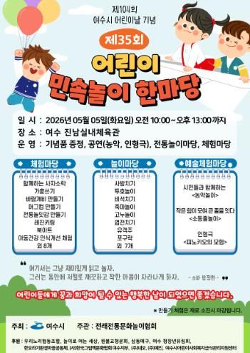 뉴한국방송뉴스통신사 신다은기자 기자 | 여수시는 제104회 어린이날을 맞아 5월 5일, 아이들이 가족과 함께 전통문화를 즐기며 마음껏 뛰놀 수 있는 민속놀이 놀이 한마당을 개최한다.