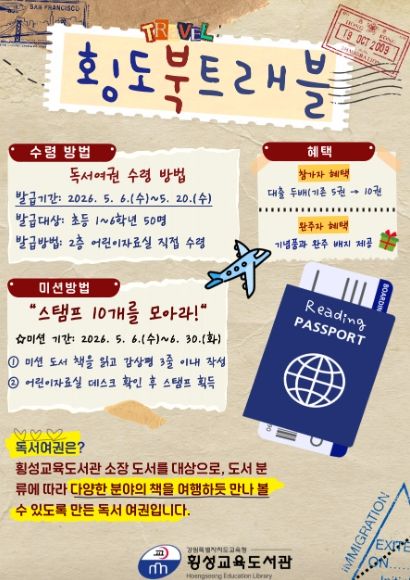 뉴한국방송뉴스통신사 신유철기자 기자 | 횡성교육도서관은 5월 6일부터 6월 30일까지 어린이들의 자발적인 독서 습관 형성과 도서관 이용 활성화를 위해 독서 여권을 활용한 ‘횡도북트래블’ 프로그램을 운영한다고 밝혔다.