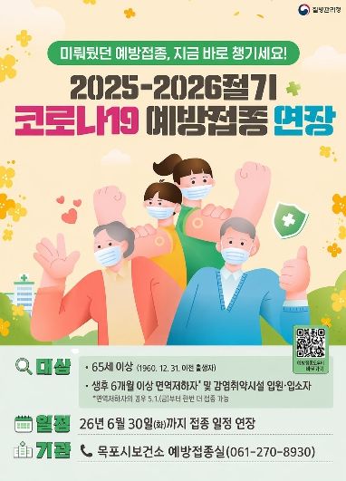 뉴한국방송뉴스통신사 신다은기자 기자 | 목포시는 2025~2026절기 코로나19 예방접종사업 기간을 오는 5월 1일부터 6월 30일까지 2개월간 연장 운영한다고 밝혔다.