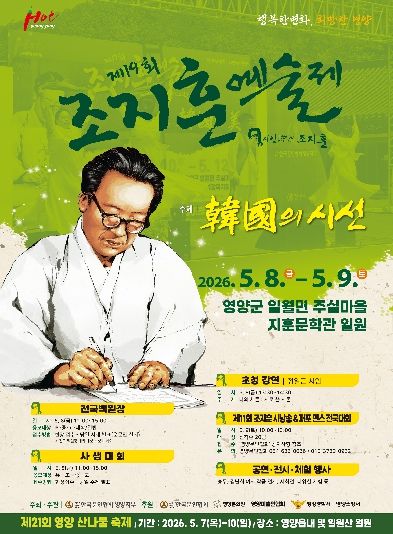 뉴한국방송뉴스통신사 신유철기자 기자 | 영양군은 우리나라를 대표하는 청록파 시인이자 《지조론》의 저자인 조지훈 선생의 문학정신을 기리고자 오는 5월 8일부터 9일까지 2일간 영양군 일월면 주실마을 일원에서 '제19회 조지훈 예술제'를 개최한다.