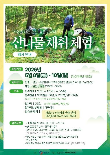 영양군 관계자는 “산나물채취체험행사는 자연 속에서 직접 봄을 느낄 수 있는 대표 체험 프로그램으로, 영양산나물축제를 더욱 풍성하게 만드는 중요한 콘텐츠”라며 “참가자들이 일월산의 자연을 체험하며 산나물의 매력을 직접 느낄 수 있기를 기대한다”라고 밝혔다.