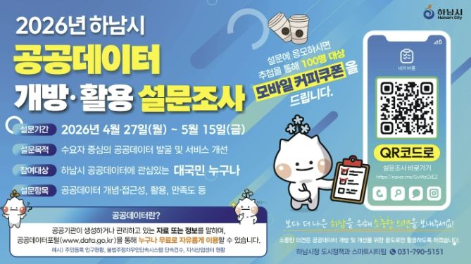 뉴한국방송뉴스통신사 신유철기자 기자 | 하남시는 시민과 기업, 연구기관 등 다양한 수요자의 의견을 반영해 공공데이터 개방 및 활용을 확대하고자 ‘2026년 하남시 공공데이터 설문조사’를 실시한다고 밝혔다.