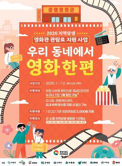 뉴한국방송뉴스통신사 신유철기자 기자 | 거창군은 다가오는 5월 가정의 달을 맞이해 군민들의 문화 향유 기회를 확대하고 지역 영화관의 활성화를 돕기 위해 ‘2026년 지역상생 영화관 관람료 지원사업’을 시행한다.
