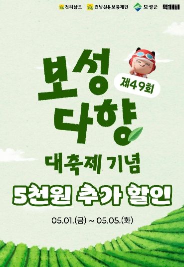 뉴한국방송뉴스통신사 신다은기자 기자 | 보성군은 제49회 보성다향대축제를 맞아 5월 1일부터 5일간 공공배달앱 ‘먹깨비’를 활용한 추가 할인 행사를 진행한다고 밝혔다.