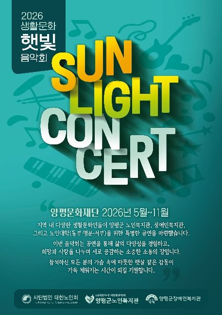 한편 양평문화재단은 ‘햇빛 음악회’ 외에도 생활문화센터 예술교실 ‘온 스테이지 양평’, ‘예술이 흐르는 라온광장 버스킹’ 등 군민 모두가 주인공이 되는 다양한 생활문화 활성화 사업을 지속적으로 추진하고 있다.