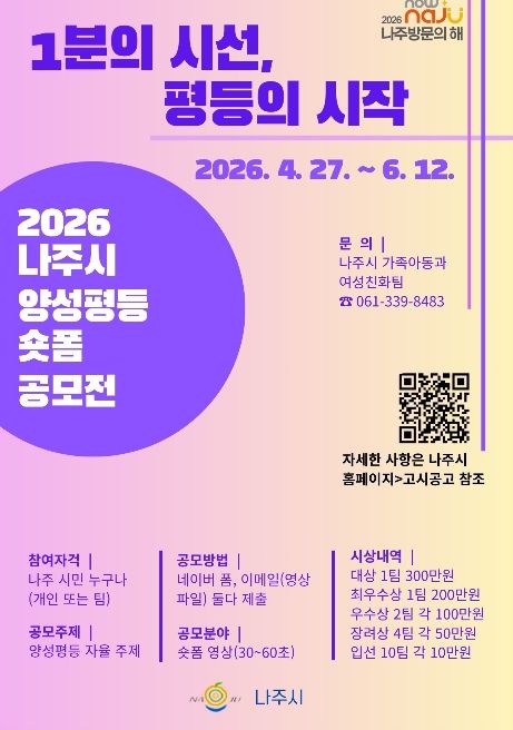 나주시는 ‘2026년 나주시 양성평등 숏폼 영상 공모전’을 추진한다고 28일 밝혔다.