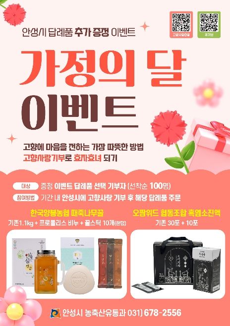 뉴한국방송뉴스통신사 신유철기자 기자 | 안성시는 오이데이와 5월 가정의 달을 맞아 고향사랑기부제 참여 확대와 지역 농산물 소비 촉진을 위해 ‘오이데이 이벤트’와 ‘가정의 달 이벤트’를 추진한다고 밝혔다.