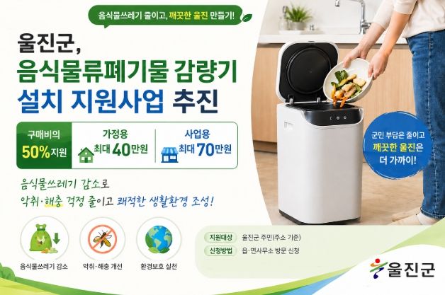 뉴한국방송뉴스통신사 신유철기자 기자 | 울진군은 음식물쓰레기의 발생량 감소와 군민 생활환경 개선을 위해 ‘음식물류폐기물 감량기 설치 지원사업(3차)’을 오는 5월 22일까지 선착순으로 모집한다.