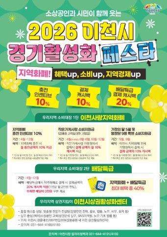 한편, 이천시에서 연말까지 진행하고 있는 ‘2026 이천시 경기활성화 페스타’의 주요 혜택 내용은 ➀지역화폐 충전 시 인센티브 10% 지급(월10만 원 한도) ➁작은가게(연매출 3억 원 이하 가맹점)에서 결제 시 10% 캐시백 지급[월 10만 원 한도 / 5월(가정의 달), 9월(추석달)은 전체 가맹점에서 결제 캐시백 혜택] ➂배달특급에서 지역화폐 결제 시 추가 20% 캐시백 지급 혜택(월 2만 원 한도) 등이 있으며, 배달특급에서 지역화폐로 결제할 경우 최대 40%까지 할인되는 놀라운 혜택을 볼 수 있다.