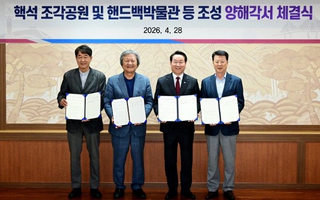 인천광역시는 4월 28일 인천시청 대접견실에서 조각가, ㈜시몬느, 블루코어PFV㈜와 ‘핵석 조각공원과 핸드백 박물관·핵석 전시관 조성’을 위한 양해각서를 체결했다.