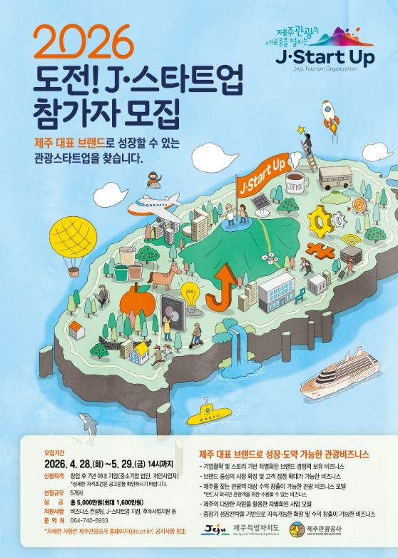 뉴한국방송뉴스통신사 신유철기자 기자 | 제주특별자치도와 제주관광공사(사장 고승철)는 오는 5월 29일까지 온라인 채널을 통해 제주 관광산업 혁신을 선도할 유망 기업을 발굴하고 육성하기 위해 ‘2026 도전! J-스타트업’ 참가기업을 모집하고 있다고 28일 밝혔다.