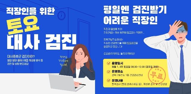 뉴한국방송뉴스통신사 신유철기자 기자 | 서울 강북구 보건소 건강관리센터가 평일에 시간을 내기 어려운 직장인들의 건강 회복을 위해 ‘직장인 맞춤형 토요 대사증후군 검진 서비스’를 운영하며 구민 건강권 확보에 나섰다.