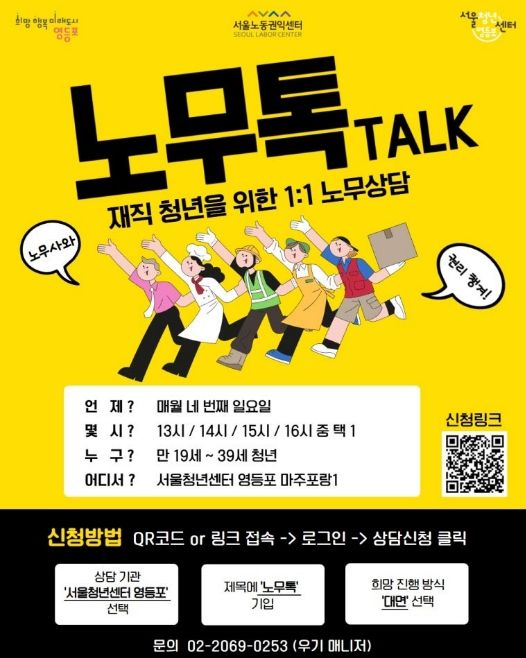 넷째 주 일요일에 진행되는 ‘노무톡(Talk)’은 청년들의 권익 보호를 위해 마련된 프로그램이다. 임금 체불, 부당 해고, 직장 내 괴롭힘 등 근로 현장에서 발생하는 고충을 전문 노무사와 1:1로 깊이 있게 상담할 수 있다. 평일에 시간을 내기 힘든 사회초년생과 아르바이트 청년들에게 든든한 버팀목이 된다.